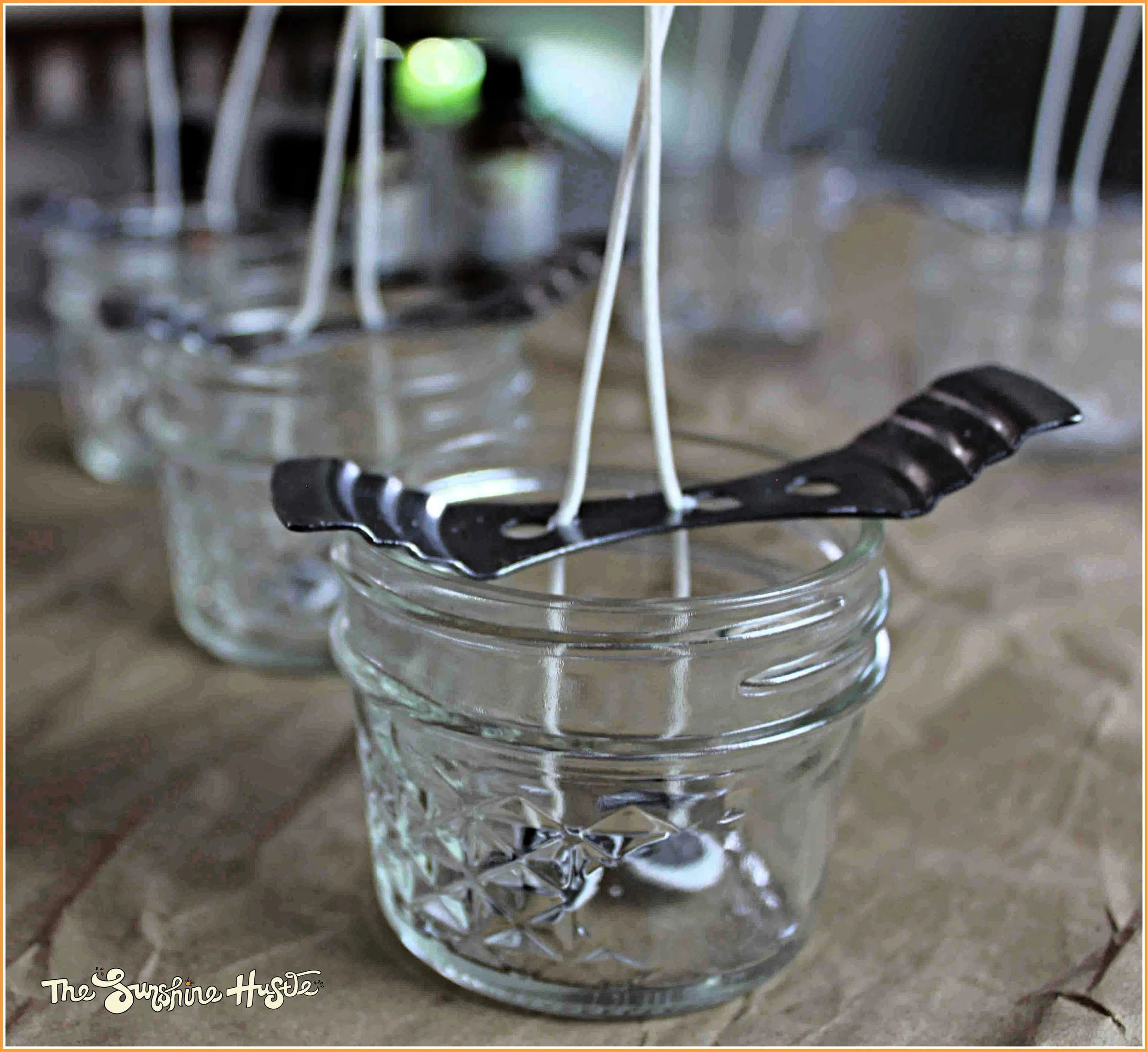 Metal candle wick holder, alternatively you can use skewers or popsicle sticks